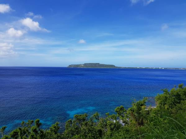 Overlook of Mt. Taipingot (Wedding Cake Mountain) & Sasanhaya Bay from clifftop roadway in Goguefun.